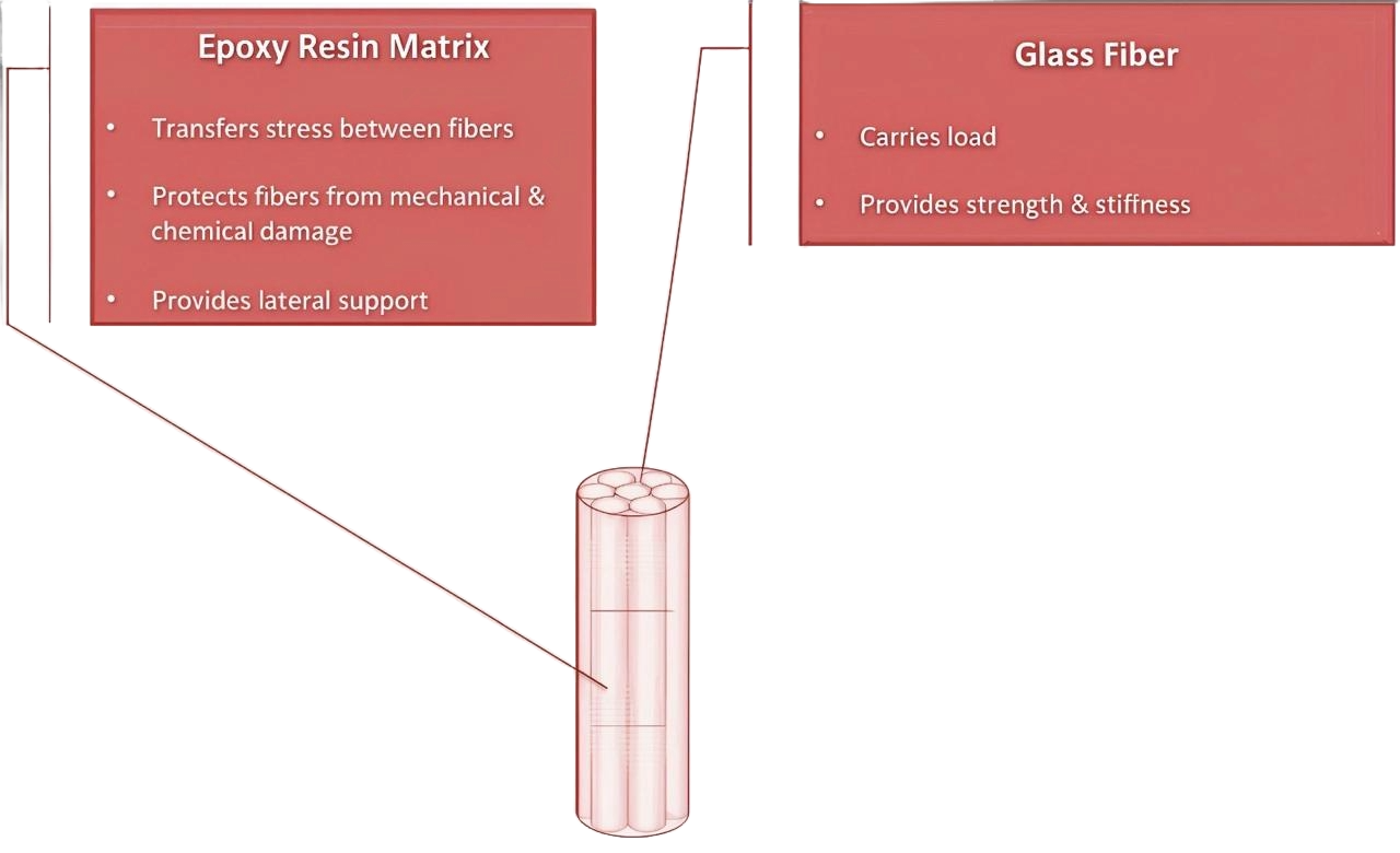 The polymer resin binds the fibers together, ensuring load transfer and protecting the fibers from environmental degradation.