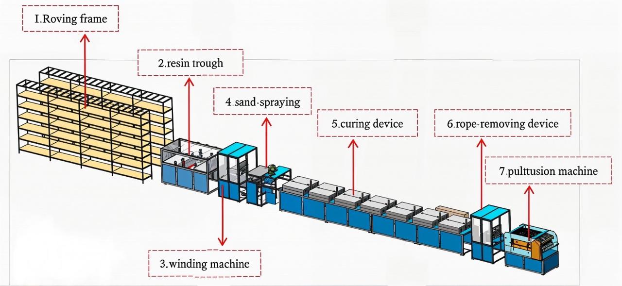 GFRP rebar is produced using a pultrusion process. In this method, continuous glass fibers are saturated with resin and pulled through a heated die to form the desired rebar shape and size. The process ensures uniformity, precision, and high-quality performance.